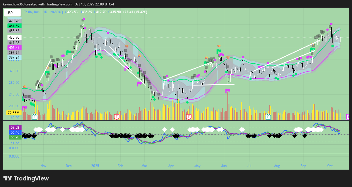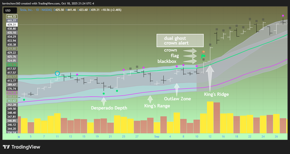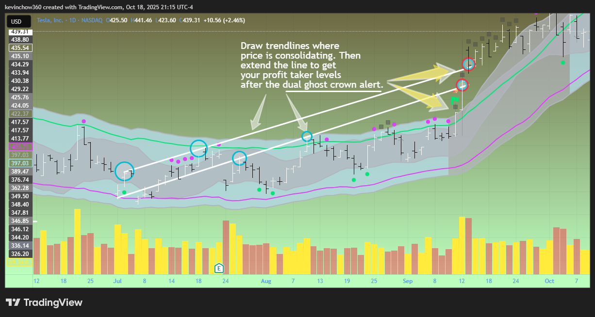How to use properly: Valid trades are signaled when there is a crown with the black box alert plus the outlaw signal. The pink circles above price signal topping out and the green circles below price signal bottoming out. When the pink circles trend upward or when the green circles trend downward, these are early signals that provide more validation if and when the dual ghost crown alert is signaled.