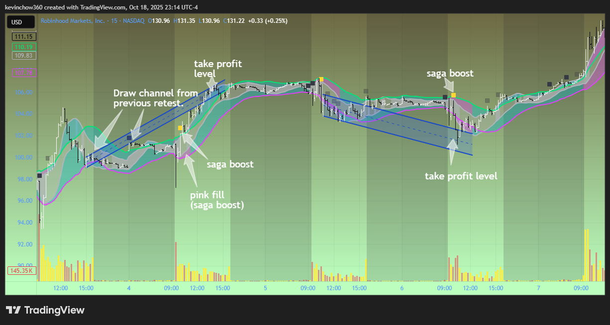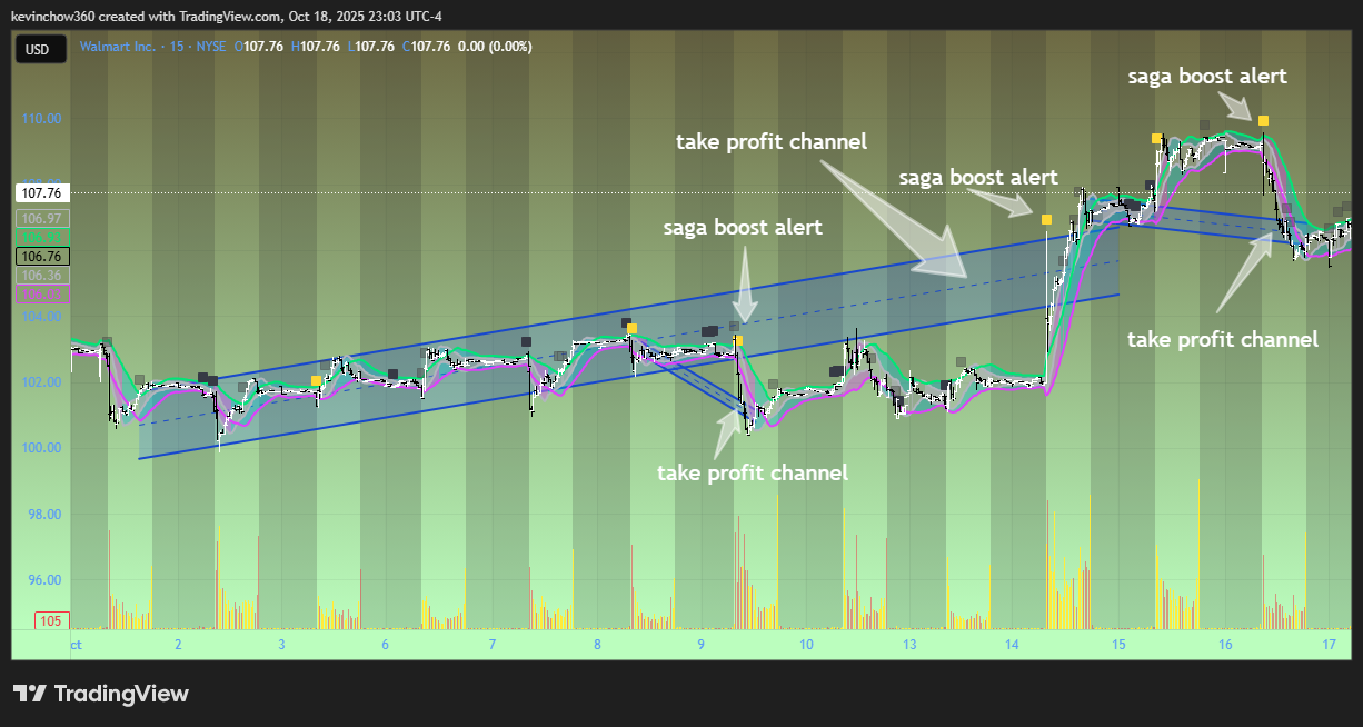 How to use properly: This indicator includes several signals, including regular Ghost Alert (grey signal), Saga Alert (blackbox signal), and Saga Boost (yellow signal with pink fill). You will want to use the Saga Boost signals for the most optimal trades. These happen when there is a breakout of the Outlaw Zone and King's Range, with simultaneous momentum acceleration as well as pink fill spacing between the two bands.